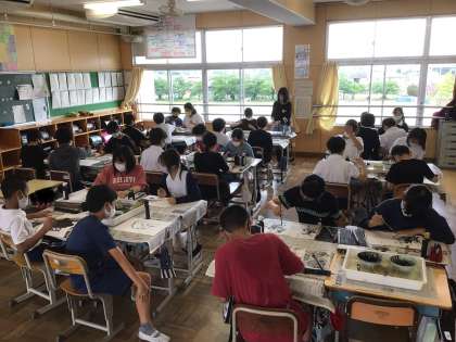 図工で、墨を使って絵を描いている様子です。にじませる、かすませる、たたくなどの技を使ってできた形から、どんなものに見えるか考え、手直しをして1枚の絵にしています。思い思いに描いています。9月に掲示する予定です。