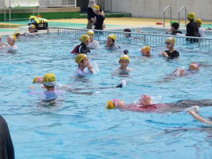 着衣泳の様子です。服を着てプールに入り、浮く方法を知りました。