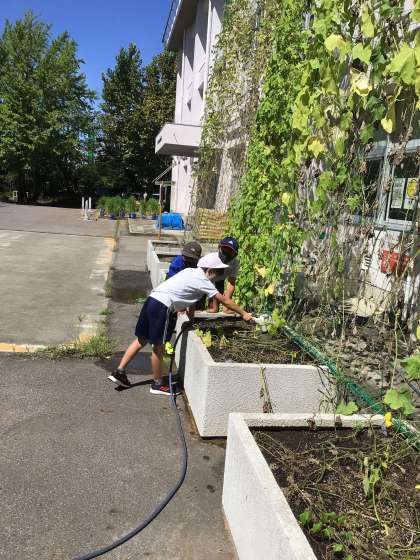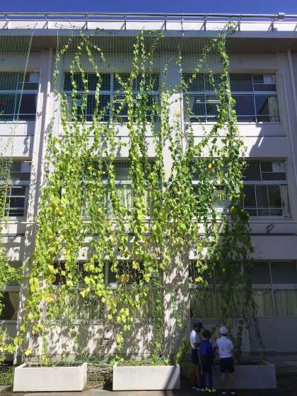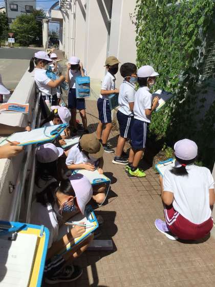 夏休み前に植えたツルレイシや緑のカーテンの植物(ツルレイシ・ヘチマ・ひょうたん)が大きく育ちました。職員室前に植えたツルレイシの観察記録を書き、緑のカーテンにも、かわいいひょうたんやゴーヤの実がなっているのを見て、笑顔がこぼれました。植物の成長の速さにどの子も驚いていました。
