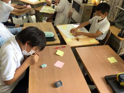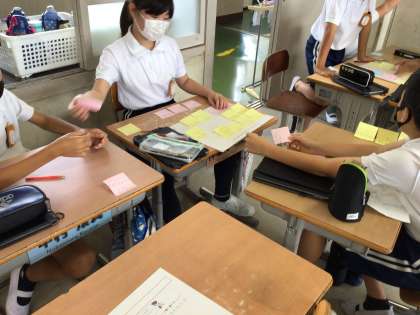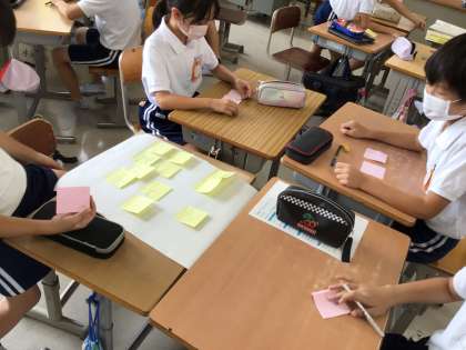 国語科「問題解決のために話し合おう」では、グループの話し合いの前に、身近なテーマで練習を行いました。話し合いの計画に沿って、付箋に問題の原因を書き、解決方法を出し合いました。最後には、出た意見からより効果的な解決方法にまとめました。授業後の振り返りでは、「意見が出すぎてまとめるのが大変だった。」「時間内にまとめることが難しかった。」「まとめるときは多数決で決めるのではなく、より説得力があり効果的な意見を優先するべきだ。」などの意見がありました。