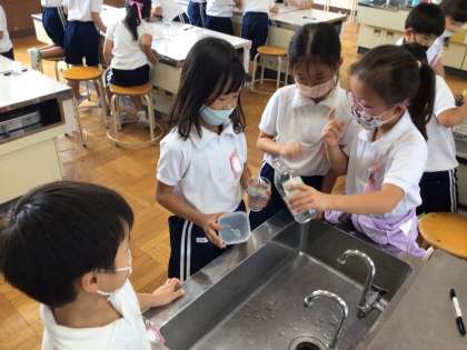 算数科「大きさくらべ」の授業では水の量の比べ方を考えました。「水を移し替えればできるよ。」「コップの中に入れてみたら?」など自分の考えをグループに伝えることができました。