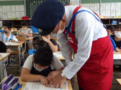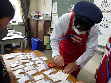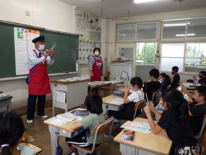 先日、手紙の書き方講座がありました。講師の方がきてくださり、表の宛名の書き方などを教えていただきました。一人一人が送る相手のことをかんがえて、丁寧に書くことができました。そして、自分の名前の頭文字がほってあるハンコをサプライズでもらい子どもたちはとても喜んでいました。120円切手を貼れば、うちわにメッセージを書いて送ることができることを知り、もっといろんな人に手紙を書きたいとうずうずしている様子が見られました。はがきを受けとった相手が喜んでくれるといいですね。