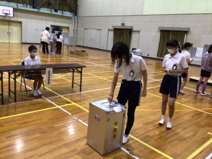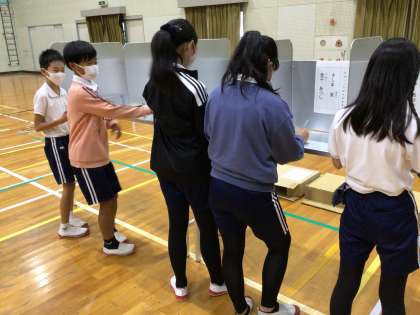 10/5に選挙出前授業がありました。実際の選挙用紙を使いながら、模擬選挙を行い、候補者名の書き方や、投票箱への入れ方を学ぶことができました。また、選挙用紙に隠された秘密を知り、子どもたちは目を輝かせていました。ふりかえりでは、「18歳になったら選挙に行きたい」と言う子がたくさんいました。とてもよい経験になりました。