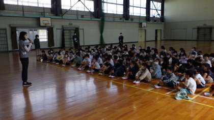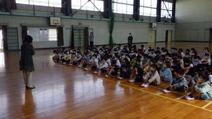 3年生の先生から児童のみなさんに、後期は、運動会をはじめとした大きな行事がたくさんあることや学校で過ごし方などの生活面で守ってほしいことを中心に話をしました。