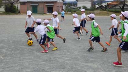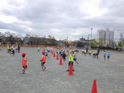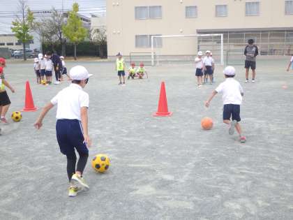 先日、名古屋グランパスから2名のコーチが来てくださり、グランパスクリニックを行いました。ボールを上に投げながら走ったり、ドリブルをしたりするなど、様々な活動を通してボールに触れあいました。初めてのサッカーで不安そうな顔をしていた子どもたちも、楽しく練習することができていました。授業の最後に行われた試合では、みんな笑顔で必死にボールを追いかけていました。また、チームでパスしながらゴールを目指すことで、一体感を味わうこともできていました。
