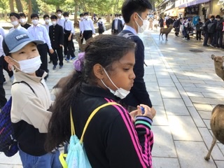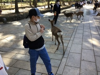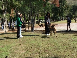奈良公園で鹿とたわむれています。
