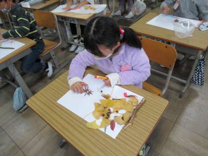 生活科「あきとなかよし」を引き続き行っています。今回は落ち葉や木の実を探し、気に入ったものを集める活動を行いました。顔より大きな葉っぱは迷わず回収!教室へ持ち帰りました。次の時間では持ち帰った落ち葉が何に見えるかを考え、画用紙に作品を作りました。「何に見えるかな?」国語の授業を思い出しながら、豊かな発想で作品を仕上げました。