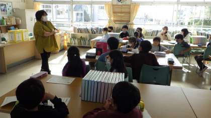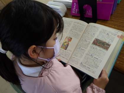 図書室に入ると、各テーブルに百科事典がおいてあり、はやく手に取って見てみたいとうずうずする様子が見られました。授業の後半には、一人一人にミッションカードが配られ、そのカードに書かれている言葉を調べました。知っている言葉もあれば、知らない言葉もありましたが、大きな百科事典を使って調べて、満足そうな子どもたちでした。
