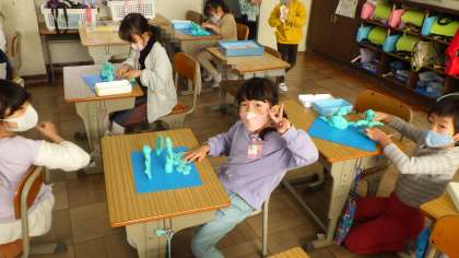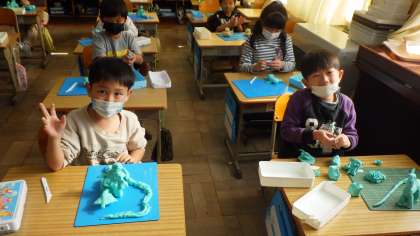 図画工作科「いっしょに おさんぽ」では、油粘土を使って作品を作りました。動物とおさんぽしている自分を思い描いて、粘土で表現しました。「細かいところまで表現できるといいね」と伝えると、「人の髪の毛を線を描いて表現できたよ」、「ワニの体の模様まで表現できた」などと達成感を感じながら活動することができました。