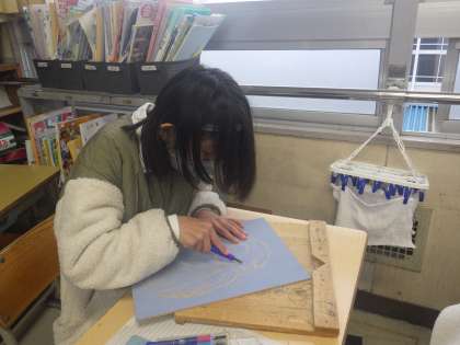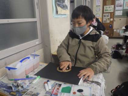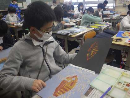 図画工作「掘り進んで、刷り重ねて」の学習では、「自然の生き物」をテーマに作品を仕上げました。 慎重に彫刻刀で掘ったり、色合いを考えながらすり重ねたりことができました。ばれんでこすったあとに、版画版から紙をゆっくりとはがすと、想像していた絵が刷られていて「わ〜、すごい〜」と歓声が上がっていました。