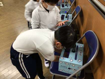 先週の身体測定では、養護教諭による手洗い指導がありました。秘密のクリームを手に塗ってから、いつものように手洗いをして、秘密のボックスに手を入れて光を当てると洗い残しが分かります。「まだ汚れが残っていた」「もっとしっかり洗わないといけない」と手洗いの仕方を見直すことができていました。健康に生活することができるように、普段から心掛けていけるといいですね。