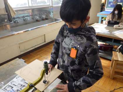 図画工作科「糸のこすいすい」の学習では、糸のこを使って伝言板を作成しています。ほとんどの子が糸のこを使うことが初めてなので、緊張した様子で操作しています。曲線を切るためには、とてもゆっくりとした速度で切ると上手に切れることに気が付いた子がたくさんいました。二時間の図工があっという間に終わってしまい、毎回惜しみつつ片付けをしています。完成が楽しみですね!図工室のお掃除を一生懸命してくれてありがとうございます! 頼りにしています。