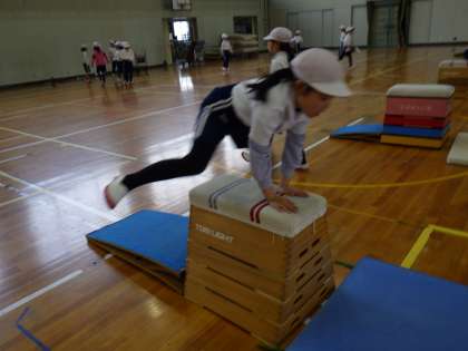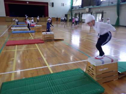 体育科「とびばこあそび」の学習で、跳び乗り・跳び下りや開脚跳びなどを練習しています。両足で踏み切ったり、両手で跳び箱を支持をしたりできるように頑張っています。ピタッと着地ができる人もいます。昨年度より上達できるように支援していきます。