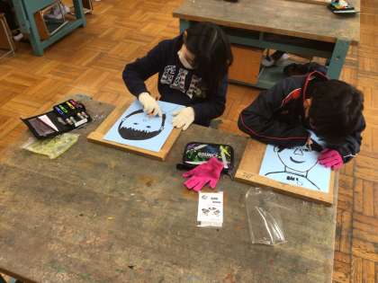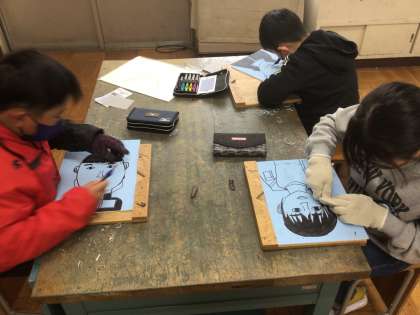 図工「ほって刷って見つけて」の学習では、自分の顔を板に描き、彫刻刀を使って線に沿って掘っています。初めて彫刻刀を使いましたが、とても集中していました。