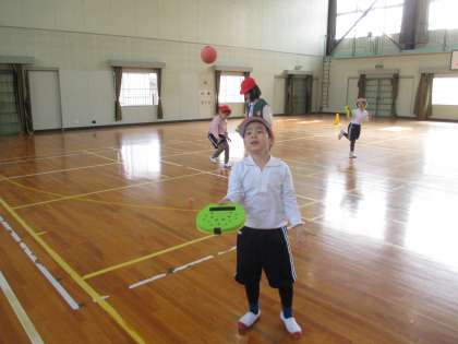 しっかり準備体操をしたのち、個々でスポンジボールを高く打ち上げたり壁に向かって打ったりするなど、楽しんで活動しています。
