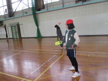 利き手にウレタンラケットをはめてボールを打つ「テニピン」をしています。