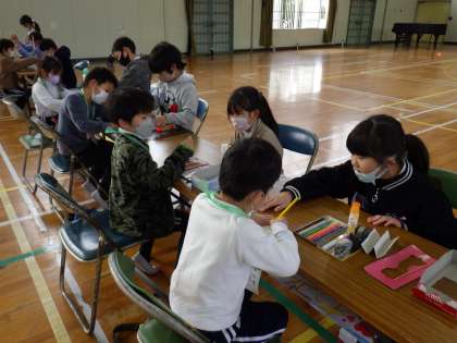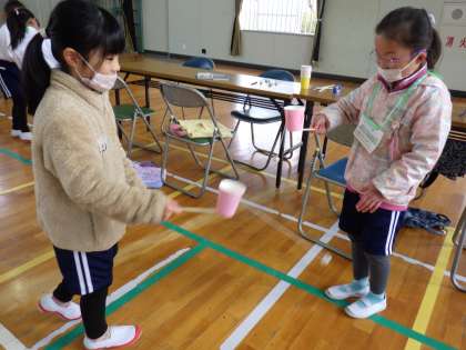 2月3日に2年4組が「おもちゃまつり」を行いました。12月頃から、2カ月かけて準備を行ってきました。おもちゃ調べや材料集めから始まり、実際に作ってみて難しいところを工夫したり、作り方や遊び方の説明を考えたりと様々な準備をしてきました。当日は、1年生に優しく丁寧に教えてあげる姿など、2年生としてのかっこいい姿がたくさん見られました。材料集めのご協力、ありがとうございました。
