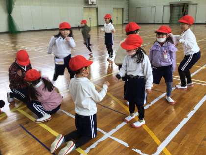 体育「ひょうげんあそび」の学習では、身体を使ったじゃんけんをしたり、動物になりきって動いたりして楽しく活動しています。子どもたちは「ひよこはピヨピヨ」「へびはにょろにょろ」と動物の鳴き声や動きのイメージを膨らませて、工夫しながら表現していました。体力向上指導員の吉田先生に教えていただきながら、元気いっぱい活動する姿が素敵でした。