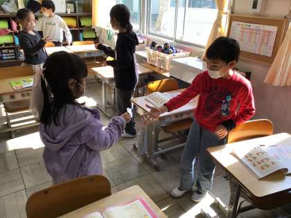 音楽「にほんのうたをたのしもう」の学習では、絵描き歌を楽しんだり、ペアで「おちゃらかほい」の歌に合わせてじゃんけんをしたりしました。生活科で昔遊びを楽しむとともに、音楽では日本の歌に親しみ、さまざまな場面で日本の文化に触れ合っています。