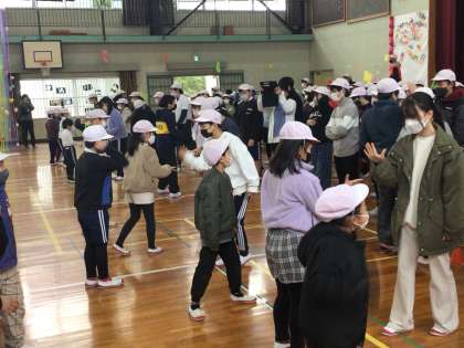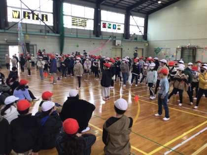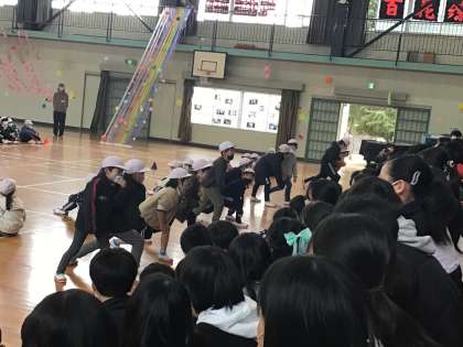 2年生は、「グー、チョキ、パワー!」と題して、6年生とじゃんけん大会を行いました。大きな声で贈る言葉を言ったり、元気よくじゃんけんをしました。実行委員は元気よく入場したり、司会・実況や動きの見本をしたりして、会を盛り上げました。6年生の優しさもあり、結果は2年生が勝ちました。