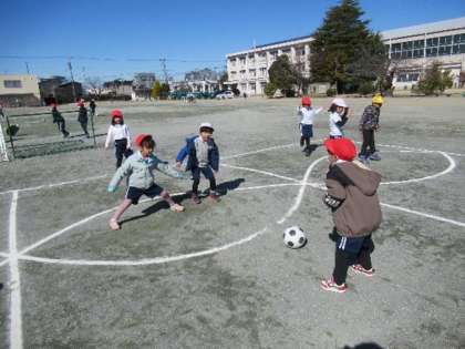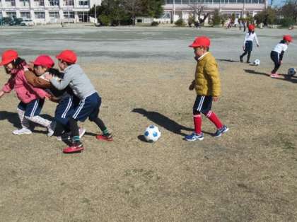 まだまだ外は寒いですが、体育の学習では「ボールけりゲーム」を楽しんでいます。足の裏でボールを止めたり、力強くシュートをしたり、自在にドリブルをしたりする練習を重ね、「シュートゲーム」や「たまごわりサッカー」に活かしています。
