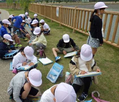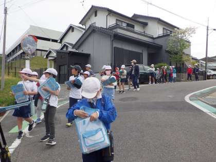 月曜日に、学区探検に行きました。東西南北の4つのコースに分かれて、前山学区の自慢となる建物や場所を探し、地図に書き込みました。社会科の学習で学んだ地図記号や、色分けを使ってしっかりと書き込むことができました。今後の社会科では、学区探検での発見を、大きな地図に書き写していく活動を行います。