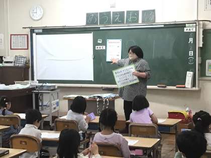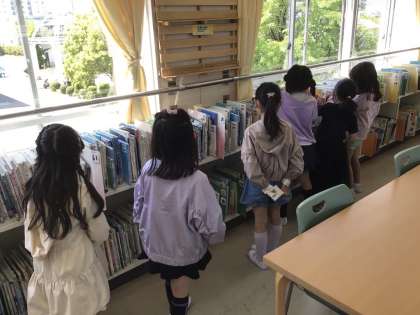 図書館司書の安藤さんが、図書室の利用指導を行っています。子どもたちは、「よみるんかたるん読書ノート」を使って、本の借り方や返し方、扱い方などクイズ形式で楽しく学びました。教室での利用指導の後、実際に図書室へ行って本の借り方を練習しました。1日2冊まで借りることができ、どの本がよいか真剣に選んで読んでいました。利用指導が終わったクラスから、前小タイムを使って本を借りに行っている子どもたちも何人かいます。これからもたくさん本を読んで、たくさんの知識を楽しく身につけていきたいですね。