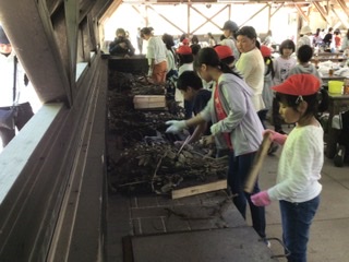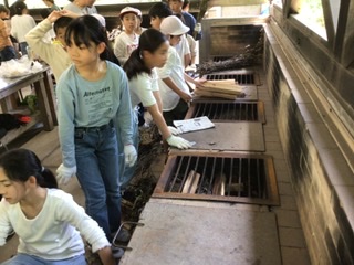所員の方が並べた薪を参考に、それぞれの班で薪を並べます。