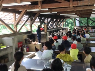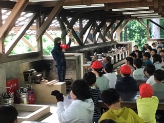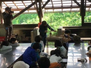 火起こしです。 所員の方の見本をしっかりと見ます。
