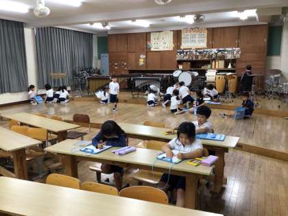 それぞれの場所にしかないものを発見し、ノートに絵でメモをしました。音楽室の楽器をたくさん見つけて目をきらきらさせていました。また、理科室のガイコツには興味津々でしたが、絵に描くのは怖かったようで、他のものを描いている子が多かったです。