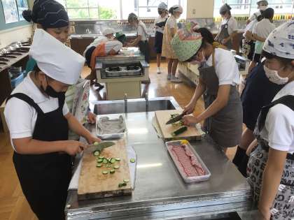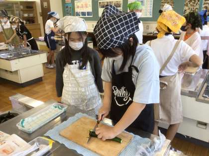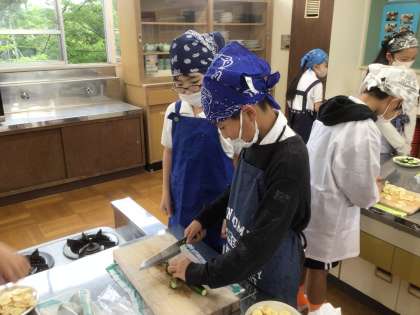 家庭科「おいしい楽しい調理の力」の学習では、安全に正しく調理器具を使って食材を切ることをめあてとして、キュウリやバナナを包丁で切りました。包丁の持ち方や切り方、まな板の使い方などに気を付けて、どのクラスも安全に調理をすることができました。また、準備や片付けでは、班で協力して活動していました。キャンプでの経験を生かしています。調理実習後の振り返りでは、「だんだんと慣れて上手に切れるようになった」「家でもやってみたい」などという言葉が聞こえてきました。お家でも実践してもらえることを期待しています。保護者の皆様には、食材等の準備にご協力いただきありがとうございました。