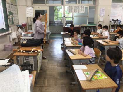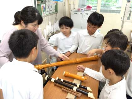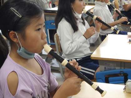 講師の方をお招きして、リコーダーの正しい吹き方や手入れの仕方を教えていただきました。きれいな音色を出すには、シャボン玉を作るように息を吹くことが大事であることを学びました。