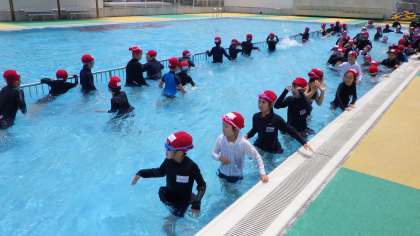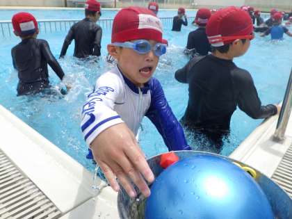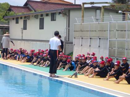 梅雨の合間の好天に恵まれた水曜日。予定通りプール開きをしました。まずシャワーを浴びて、柴田先生から諸注意を聞きました。次に、全員でプールの中を歩いて渦を作る「洗濯機」をしました。最後に、クラス対抗で「宝物拾い」をしました。みんな大いに盛り上がりました。