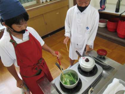 家庭科の学習では、前回の包丁の使い方の実習に続き、ゆでる調理の実習を行いました。ゆでる食材によって水からゆでるもの、沸騰してからゆでるものがあること、ゆで時間も様々であることを実際に調理をしながら学びました。ゆで卵が完全に固まらず、温泉卵になってしまったグループもありましたが、失敗することも実習の醍醐味です。お家でぜひリベンジしてみてください。