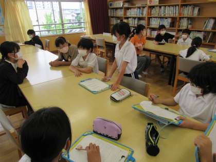 国語科「知りたいことを聞き出そう」の学習では、委員会活動について知りたいことを6年生にインタビューしました。相手の答えを聞いたうえでさらに詳しく質問し、充実した活動になりました。今後の委員会活動に役立てていきたいですね。