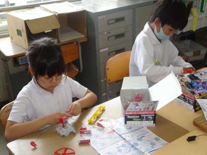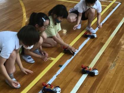 理科「電池のはたらき」の学習では、乾電池を使って、電流の大きさや向きについて学びました。最後に直列つなぎとへい列つなぎで作った車はどちらが速いか体育館で実験しました。車を作ることに苦戦していましたが、直列つなぎの車がとても速いことがわかり、とても楽しそうでした。