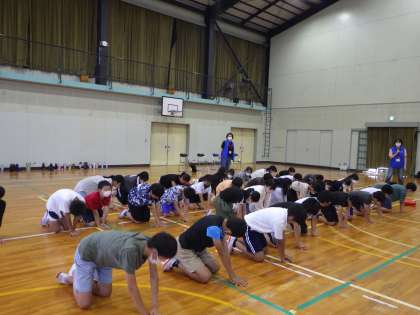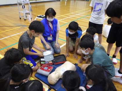 13日(火)に、豊田市消防署の方をお招きして「応急手当講習会」を行いました。動画を見た後に、胸骨圧迫訓練機器を用いて一人一人実践しました。リズムに合わせて、胸の中央を、手の根本で約5cmくらいの深さになるまで力強く圧迫しました。子供たちは真剣に行うことができました。また、AEDは前山小学校の職員室玄関や、豊南交流館玄関にあることを確認しました。