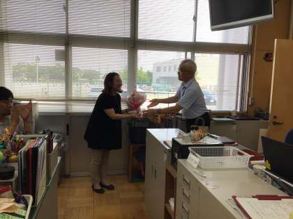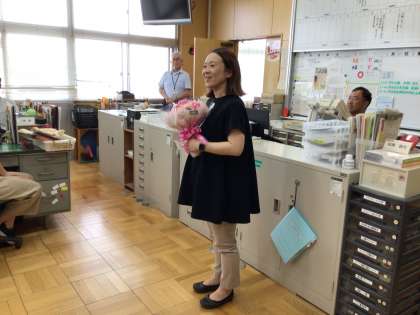 養護教諭の茉莉香先生が26日(月)から産休に入られるため、校長先生から花束を渡していただきました。病気やケガをしたときはもちろん、少し心が疲れてしまったときに茉莉香先生に話を聞いてもらった子もいるのではないでしょうか。私たち職員にとっても、茉莉香先生はなくてはならない存在です。元気なお子さんが生まれることを心より願っています。