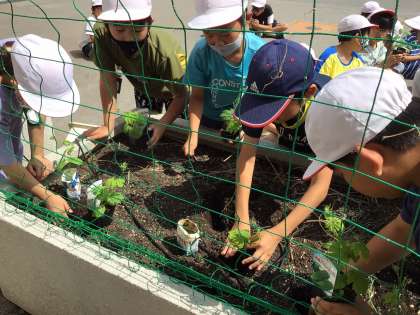 理科の授業で種から育てていて、苗が育った子も発芽しなかった子もいましたが、協力して花壇に穴を掘って、優しく土を押さえていました。