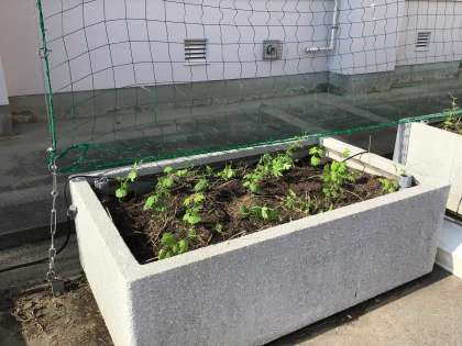 緑のカーテンを作るために、ツルレイシの苗を植えました。