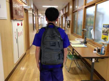 このように、肩ヒモをしっかりしめて、ランドセルのように上の方で背負うと、体に負担がかかりません。同じ重さでも軽く感じるはずです。ぜひ比べてみてください。