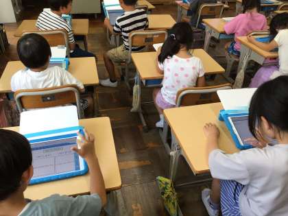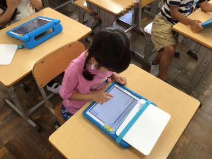学習用タブレットを利用してキャリアパスポートを作成しています。キャリアパスポートは小学生から高校生までの自身の成長や変容を記録して持ち上がっていくポートフォリオのことです。「1ねんかんのめあて」、「ぜんきのめあて」を記入し、夏休みにタブレットを持ち帰ります。ぜひお家でご覧になり、励ましや応援の声をかけてあげてください。