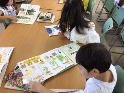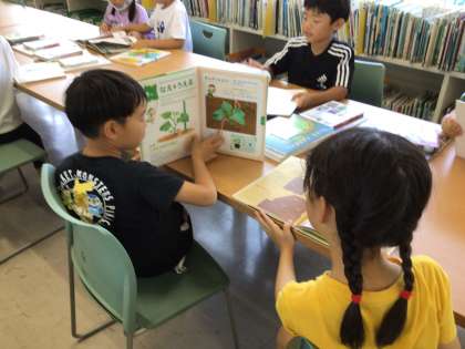 今回の授業では、学んだ内容に関連させた学習を行いました。司書の安藤さんに様々な種類の野菜の本を使って、知りたい情報を本から探す方法について教わりました。目次を見てから探すと、すぐに知りたい情報を見つけられることを学べました。子どもたちは一生懸命本を読んで野菜の植え方や、調理方法を調べていました。生活科で育てている野菜にもいかせると良いですね。