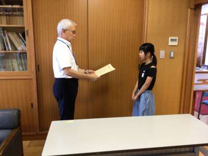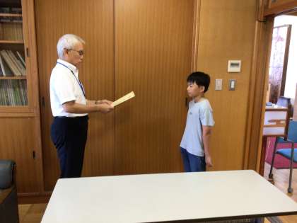 夏休み前集会の中で、3名の児童の表彰を行いました。