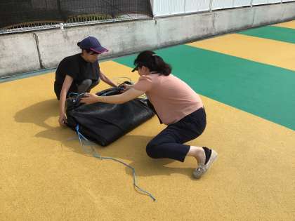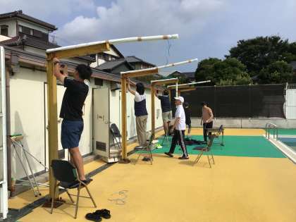 夏休みはいかがお過ごしですか。子どもたちが楽しんだプールの日よけを、本日撤去しました。倉庫の清掃やビート板の片付けなども合わせて行いました。