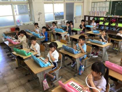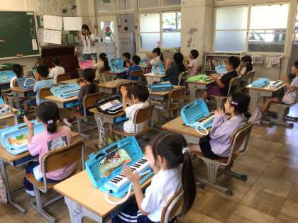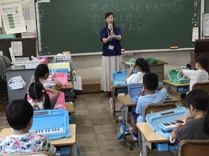 部品の確認や、使うまでの準備はもちろん、鍵盤ハーモニカを吹くための息の使い方も、音楽やリズムに合わせて楽しく覚えました。