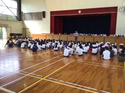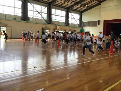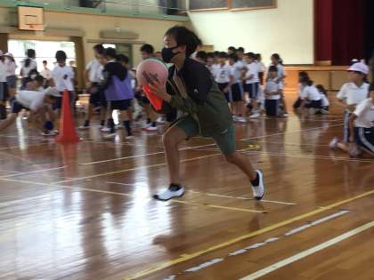 後期スタートの10日は学年集会を開きました。柴田先生からお話を聞いた後、レクリエーションで「学級対抗ボール運び」をしました。ボールをコーンにのせて、ソフトクリームに見立て、落とさないように運びました。自信のある子は片手で、慎重派は両手で押さえながら走りました。楽しい時間を過ごすことができました。