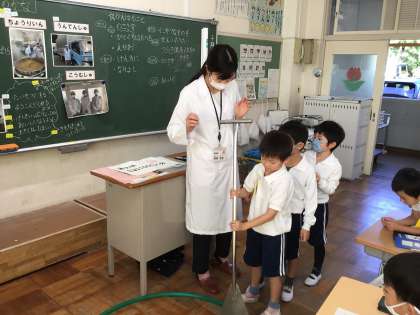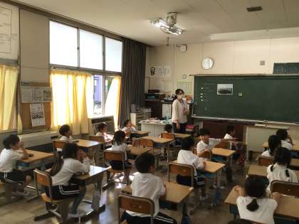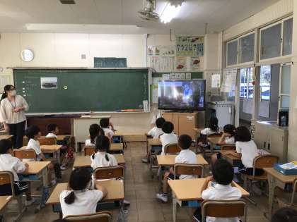 本日、1年生は「給食は誰がつくっているのかな」について平和給食センターの柴田さんと坂井さんをお招きして学習しました。給食には、栄養の先生、食べ物を育てる人、食べ物を届ける人、調理員、運転手、公務手の方など多くの皆様のご協力があって私たちのもとに届いていることを知りました。子どもたちは、給食センターの動画において、一生懸命お仕事されている姿に釘付けでした。実際にスパテラを触り、重さを実感することができました。明日からの給食がさらに楽しみです。
