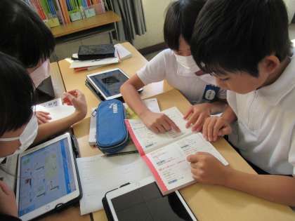 18日(水)に、中央図書館から講師の先生に来ていただき、本から情報を取り出すコツを教えていただきました。情報を扱うには多くのルールがあることも知り、驚いている様子もありました。国語科「和の文化について調べよう」でさっそく、教えていただいたコツを思い出し、本を使って調べることができていました。