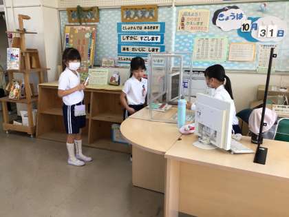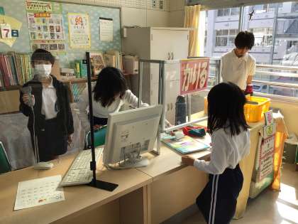 休み時間に本を借りに来る子のために、図書委員さんが活動してくれています。返却や貸し出しの手続きの操作も手慣れたものです。いつもありがとう!